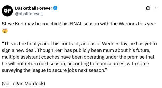 北京时间1月22日,据NBA记者Logan Murdock报道,科尔的未来,仍悬而未决,这可能是他执教勇士的最后一个赛季。